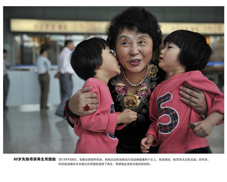 2013年9月8日,安徽合肥,刚刚步出机场的成琳搂着两个女儿,有些激动,她20多天没有见面。四年前, 60岁的成琳在失去独女后却冒险选择了再生,希望借此安抚失独后的创伤。安徽合肥晚报吴芳摄影
