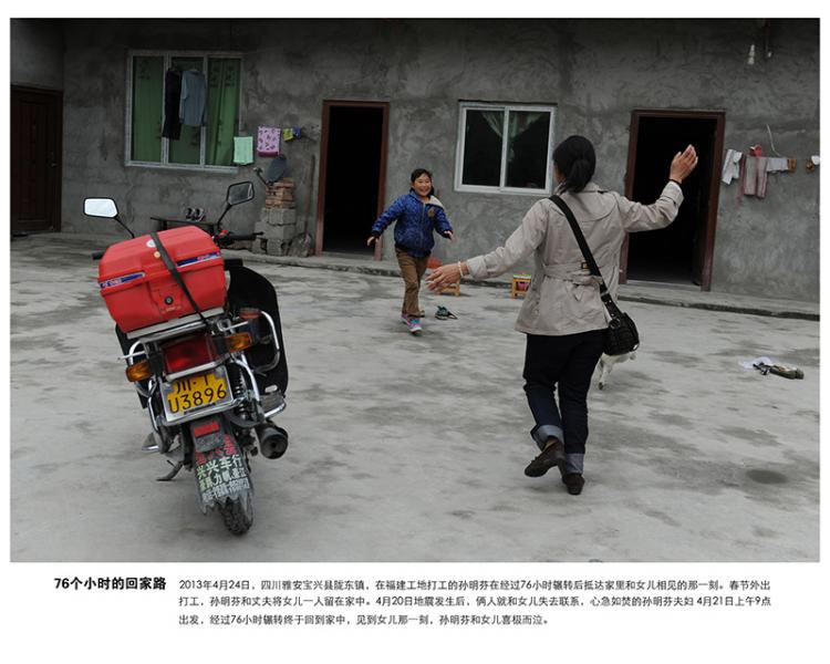 2013年4月24日,四川雅安宝兴县陇东镇,在福建工地打工的孙明芬在经过76小时辗转后抵达家里和女儿相见的那一刻。春节外出打工,孙明芬和丈夫将女儿一人留在家中。4月20日地震发生后,俩人就和女儿失去联系,心急如焚的孙明芬夫妇 4月21日上午9点出发,经过76小时辗转终于回到家中,见到女儿那一刻,孙明芬和女儿喜极而泣。安徽合肥晚报吴芳摄影