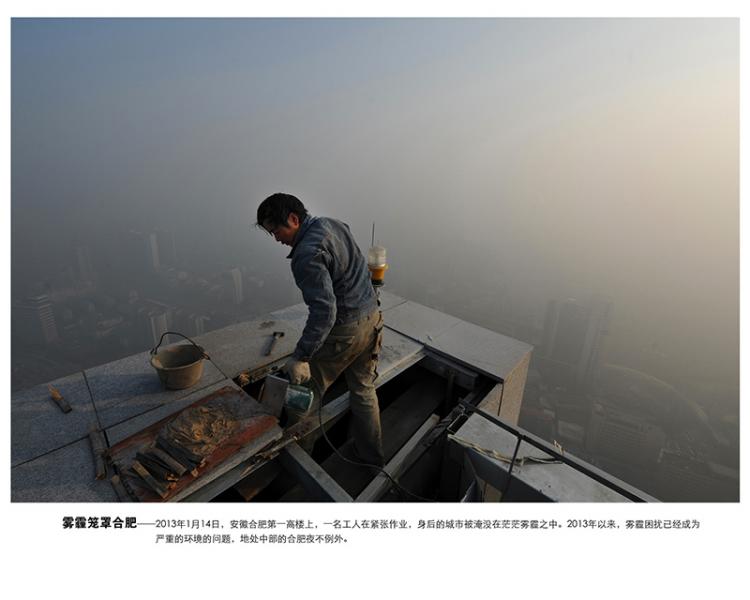 2013年1月14日,安徽合肥第一高楼上,一名工人在紧张作业,身后的城市被淹没在茫茫雾霾之中。2013年以来,雾霾困扰已经成为重大的环境的问题,地处中部的合肥夜不例外。安徽合肥晚报吴芳摄影