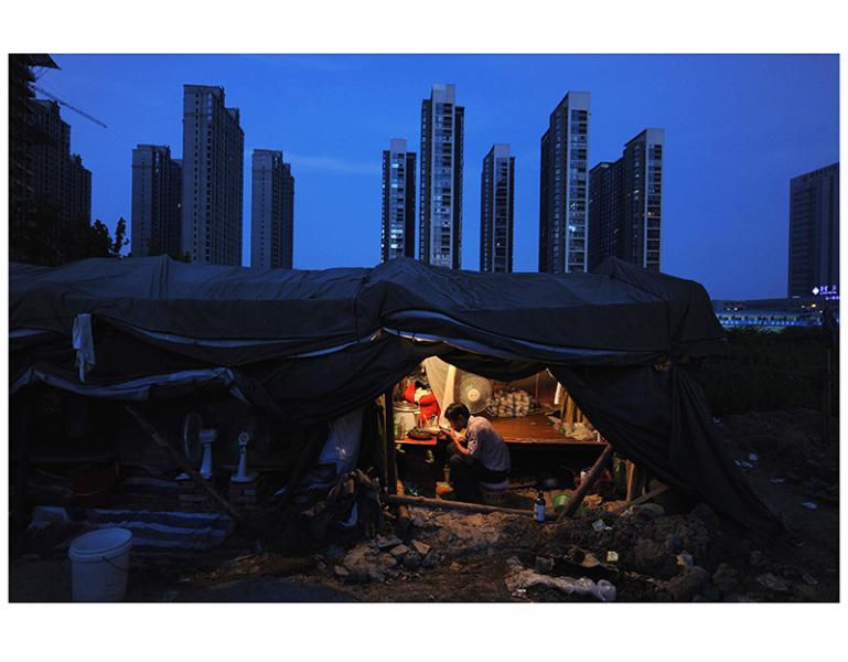 2012年7月26日,安徽合肥闹市中,一民工在工棚里用晚餐。身后的高楼为他们所建,但却没有他们容身之地。 吴芳.