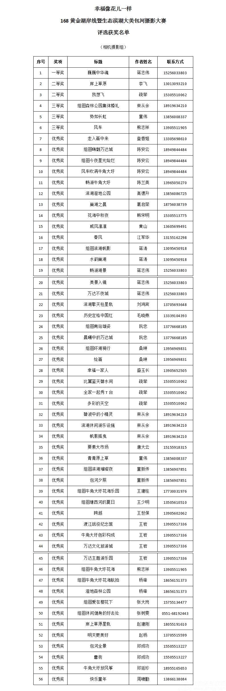 征集活动结束后,由省摄影家协会专家及包河区相关领导组成的5名评委,从应征作品中反复审阅,反复讨论,对入围的每一篇作品都进行了认真阅读和严格审核。经过初评、复评、终评,共评选出90幅(组)优秀摄影作品,其中相机组一等奖1名,二等奖2名,三等奖3名,优秀奖50名;手机组一等奖1名,二等奖2名,三等奖3名,优秀奖28名。