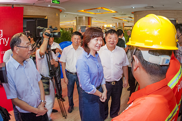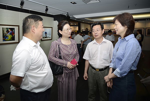 中国摄影家协会主席、分党组书记王瑶(右一),国资委宣传局副局长韩天(左二),国资委宣传局思想教育处处长张铁甲(右二),中铁四局董事长、党委书记张河川(左一)在影展现场交流观感