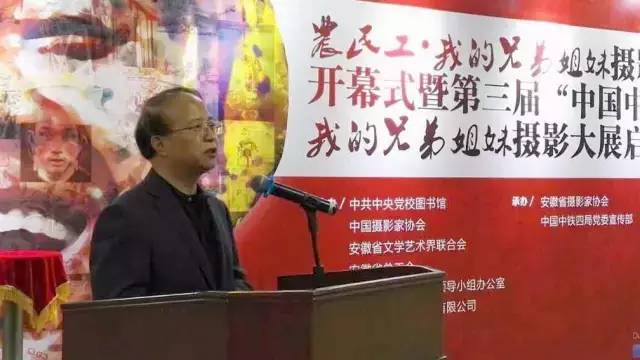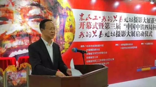 安徽省政协副主席、安徽省总工会主席童怀伟致辞。他说,建筑企业一直是农民工高度集中并发挥主体作用的重要行业。作为驻皖央企,中国中铁四局始终坚持全心全意依靠职工办企业,始终坚持把农民工作为企业生存发展的主体力量,始终注重维护和发展农民工合法权益,积极探索农民工管理服务“五同”、“五自”的工作品牌,着力打造农民工“幸福小家”,特别是努力营造全社会关心关爱农民工的浓厚氛围,精心组织、连续举办“农民工•我的兄弟姐妹”摄影大展,产生了良好的社会影响,也为其他企业做了榜样。本次影展汇集了来自全国各地的优秀作品,集中展示了农民工昂扬向上的精神风貌,具有强大的思想震撼力和艺术感染力。