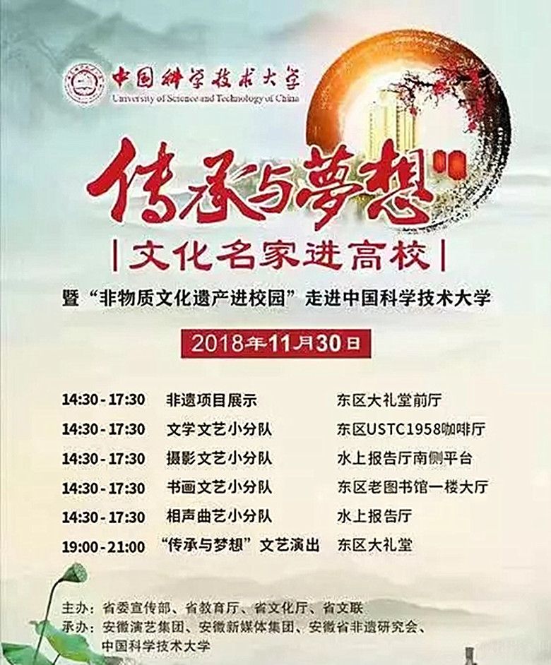 11月30日,由省委宣传部、省教育厅、省文化和旅游厅、省文联共同主办的全省“文化名家进高校”暨“非遗进校园”活动走进中国科学技术大学。省委常委、宣传部长虞爱华,副省长王翠凤,中科大党委书记舒歌群出席。省委宣传部副部长洪永平,省文联党组书记、副主席、书记处第一书记何颖等陪同参加。