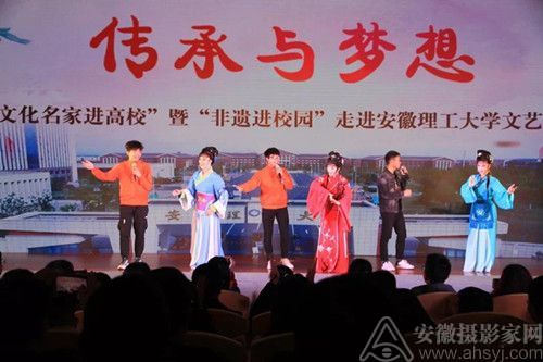 夜幕降临,作为本次活动重头戏,一场文化名家、非遗传承人与安徽理工大学师生联袂举办的《传承与梦想》文艺演出,在山南校区大礼堂举行。中国戏剧“梅花奖”获得者何云、汪育殊,中国曲艺“牡丹奖”获得者孟影、孙铭泽、周玉峰,中国民间文艺“山花奖”获得者罗西林,上海白玉兰戏剧表演艺术奖获得者夏圆圆等诸多文化名家,纷纷登台献艺。
