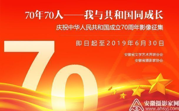 为庆祝新中国成立70周年,深入学习贯彻习近平新时代中国特色社会主义思想,特别是习近平总书记关于宣传思想工作重要思想和文艺工作重要论述,通过影像折射时代发展,多角度反映70年来安徽各项事业取得的积极变化,追忆70年波澜壮阔,致敬伟大时代伟大成就,激励和鼓舞广大人民群众积极投身现代化五大发展美好安徽建设火热实践,安徽省文联、安徽省摄影家协会特举办“70年•70人——我与共和国同成长”摄影图片征集活动,欢迎广大摄影家、摄影工作者积极参与、踊跃投稿。