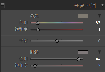 3、分离色调的调整。本着让原片整体“暖融融”的色彩感觉,让高光部分和暗部都倾向暖色调。调整和数值如下。